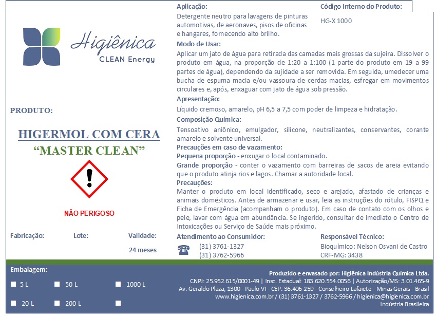 Higermol com cera “Master Clean” é um detergente neutro para lavagens