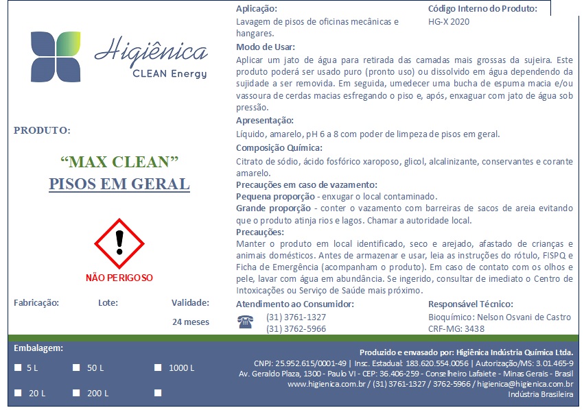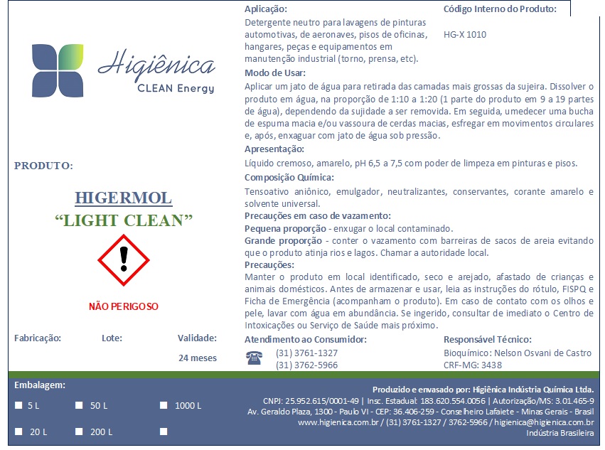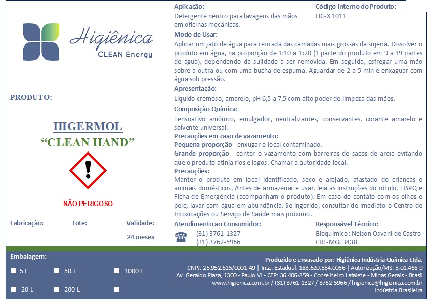 O Higermol com cera “Master Clean” é um detergente neutro para lavagens de pinturas automotivas, de aeronaves, pisos de oficinas e hangares, fornecendo alto brilho. O Detergente Cremoso Industrial “Clean” é um detergente neutro para limpeza e lavagens manuais em geral. O Sabão Pastoso Antisséptico “Clean” possui ação na limpeza, desinfetante, sanitizante e repelente de formigas, moscas, insetos, etc para saunas, banheiros, hospitais, clínicas, azulejos e pisos em geral. Possuímos ainda a linha de produtos para limpezas alcalinas e ácidas em tanques, tubulações, envasadoras, pasteurizadores nas indústrias alimentícias e de bebidas em geral.