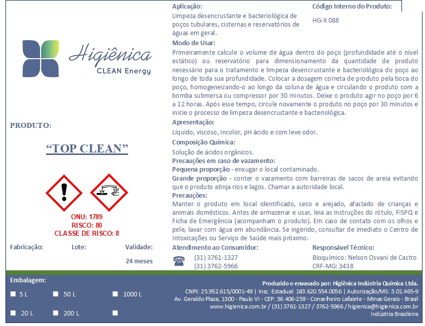 O produto Top “clean” é indicado para aplicação nas limpezas desencrustantes e bacteriológicas de poços tubulares, cisternas e reservatórios de águas em geral.
