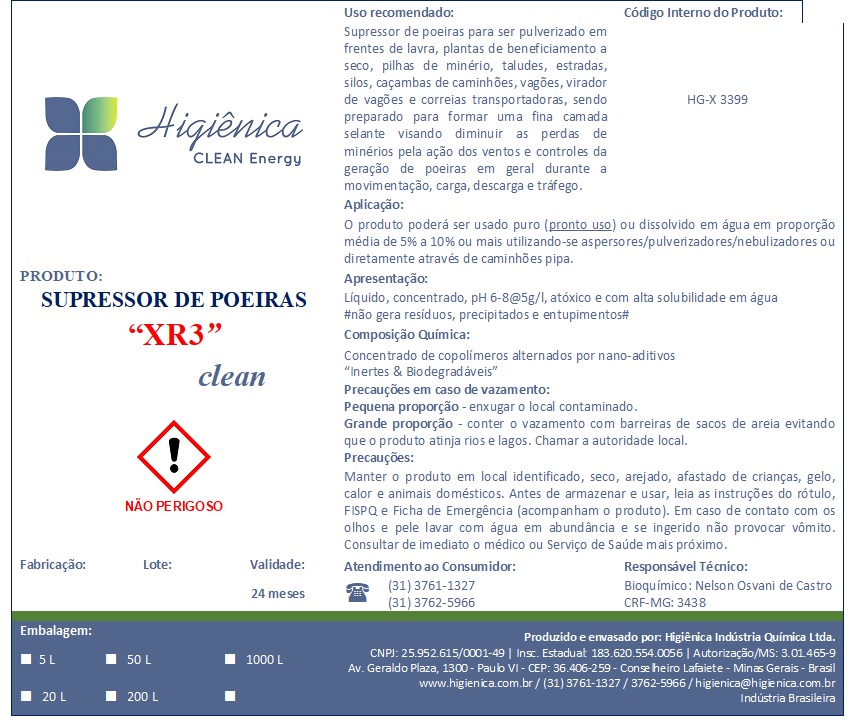 O Supressor de poeiras “XR3” clean é indicado para ser pulverizado em frentes de lavra, plantas de beneficiamento a seco, pilhas de minério, taludes, estradas, silos, caçambas de caminhões, vagões, virador de vagões e correias transportadoras, sendo preparado para formar uma fina camada selante visando diminuir as perdas de minérios pela ação dos ventos e controles da geração de poeiras em geral durante a movimentação, carga, descarga e tráfego em vias não pavimentadas.