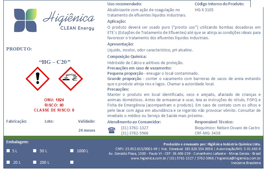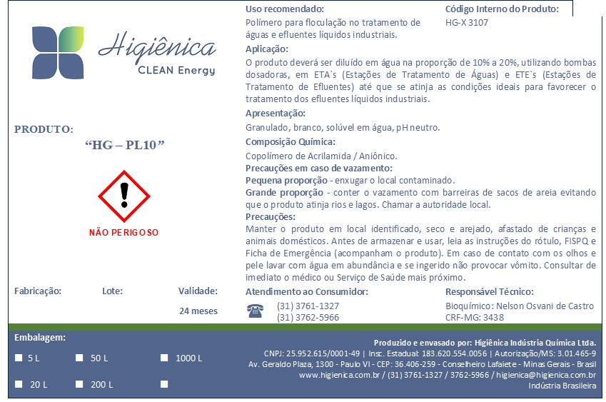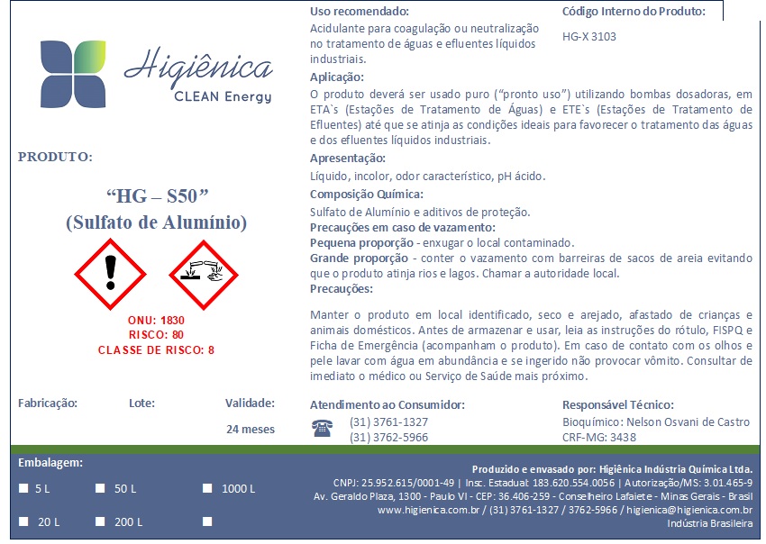 Em todos os usos realizados em bancada de laboratório e nas próprias ETA’s e ETE’s pôde-se comprovar a importância do tratamento dos efluentes industriais em 3 etapas, sendo a primeira através de produto coagulante/acidulante/sulfato de alumínio líquido (HG-S50), depois neutralizante/alcalinizante líquido (X100 clean) e por último com o floculante em emulsão (HG-PLX). Os produtos possuem ação de coagulação e floculação no tratamento de águas e efluentes provenientes de processos industriais e de tratamento de minérios em geral.